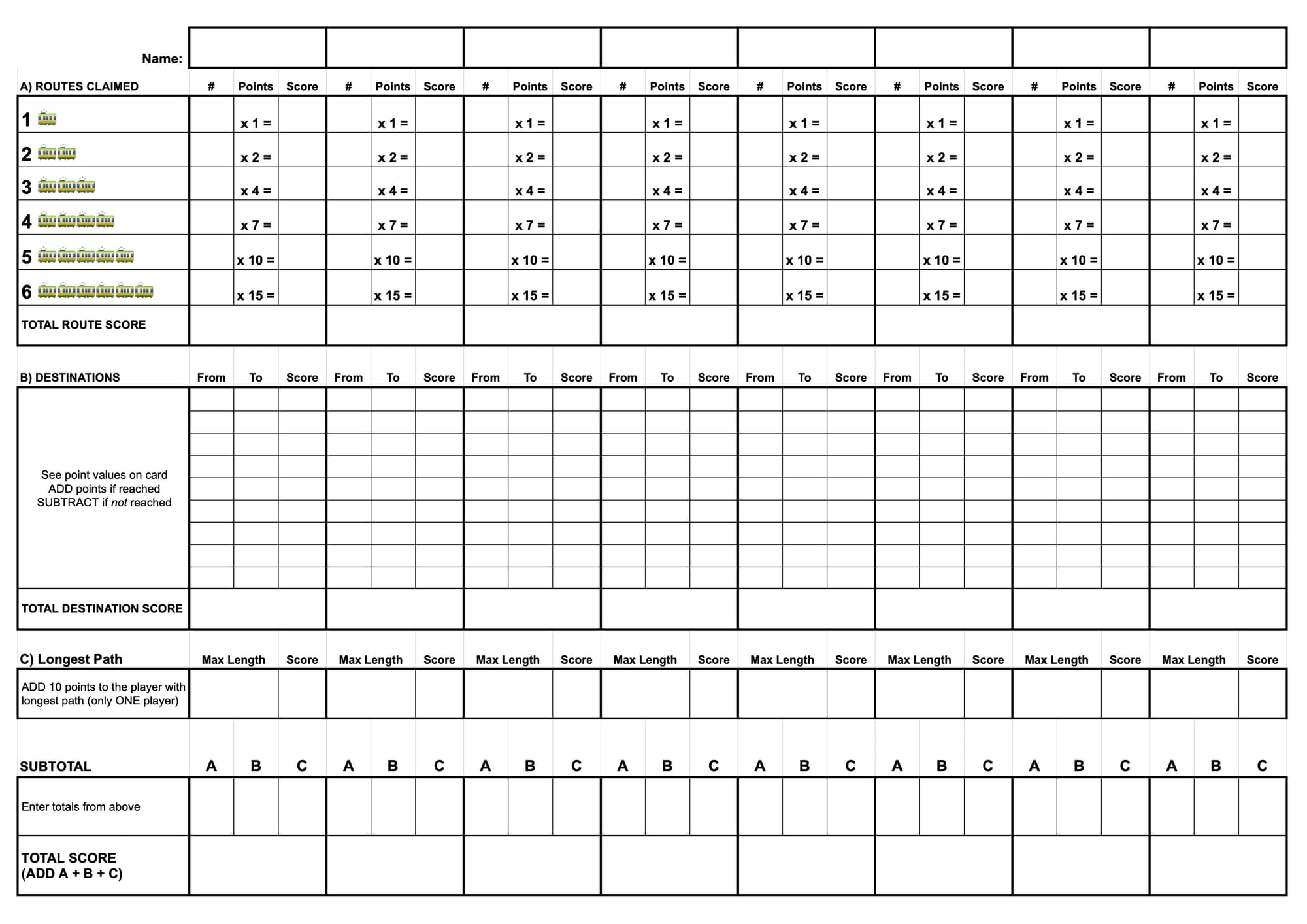 This scoring sheet is meant to fix that. It walks through scoring step by step in a clear, boring, methodical way. You just follow the rows, fill in the numbers, and you’re done. No mental juggling, no recounting, and – best of all – no snapping at people to be quiet while you try to remember whether you already added the longest route bonus.